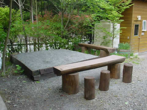 炊事場の横に砂場をつくりました。砂遊び用のバケツやシャベルも置いてます。 砂場脇に丸太テーブル(ベンチにもなります。)もご利用ください。