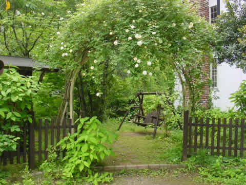 黄色いバラのアーチをくぐると「たぁきぃ広場」があります。